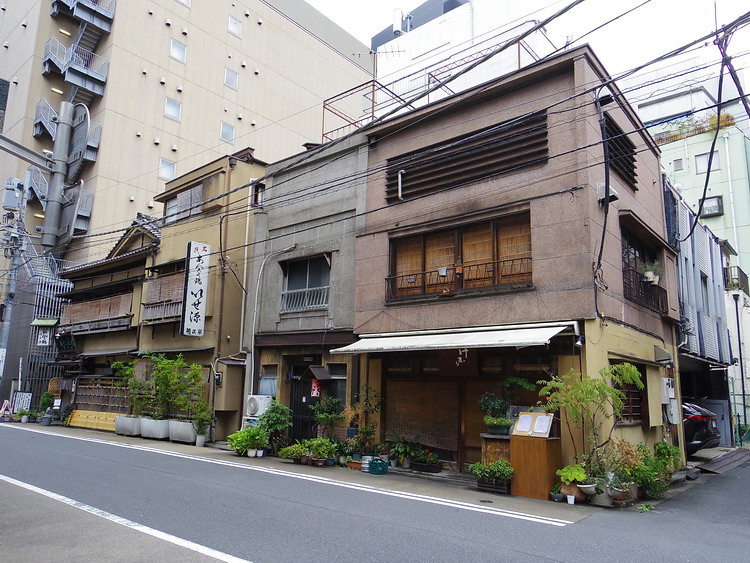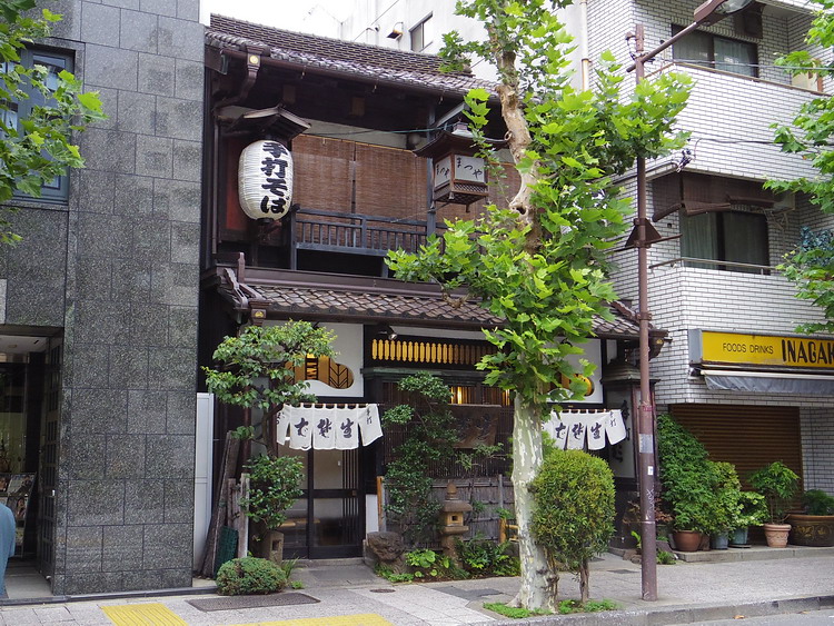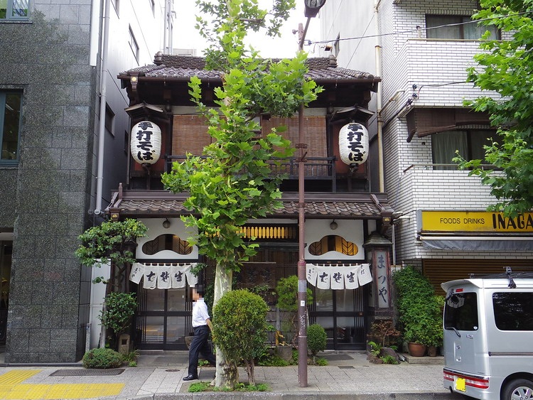 | 手打そばの 神田まつや・・・ 松と矢にちなんで、松の木と矢羽根をかたどった小窓、 提灯など楽しげなファサード・・・ ほとんど左右対称に作られていて、出入口も二つ在ります。 東京都選定歴史的建造物とのことです。 |