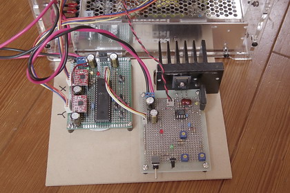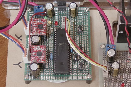 | XY軸駆動の制御基板の拡大。 上に載っている、黒い大きなICがPICマイコン。 その右には、押しボタンが並んでいます。 2枚の赤い子基板が、A4988ステッピングモータードライバモジュールで、 3Dプリンターに使われていたものを、そのまま移植しました。 写真上方が、X軸駆動用、下方がY軸駆動用です。 |