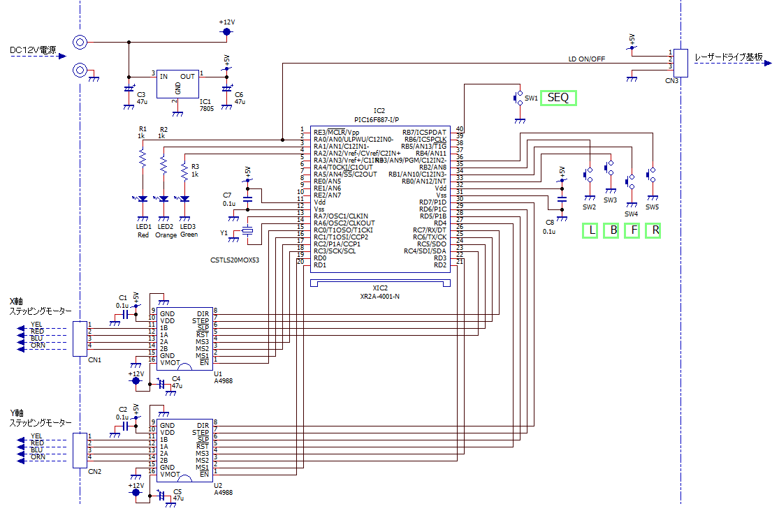| XY軸駆動の制御回路、接続図です。 PICマイコン(IC2)と、ステッピングモータードライバモジュール A4988(U1,U2)を直結し、 制御しています。 SEQ(SW1) スイッチは、窓抜き作業のシーケンススタート。 L:Left B:Back F:Forward R:Right は、レーザーヘッドを、それぞれの方向へマニュアルで移動する為のスイッチ。 PICマイコンのファームウェアは、アセンブラで書くことになりますが、全て自作しました。 この年になると、頭も回らず少々きつい作業です。 レーザーヘッドが無いので、未だ、窓抜きはできませんが、 SEQスイッチを押すと、ビー・ガーと言いながらステッピングモーターが回り、 窓抜きシーケンスを開始します。 見てると、なかなか面白いもので、達成感もひとしおです。 |