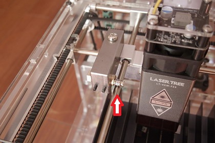 | レーザーカッターは、レーザーヘッドの傾き対策が不十分だったようで、 窓桟が歪む現象が、再び散見されたため、 カウンターウエイトに、ボールベアリングの支え(↑矢印)を取付け、 レーザーヘッドが、手前に傾くのを抑える様にしました。 Φ10真鍮棒の、偏心した位置にボールベアリングを取り付け、 真鍮棒を回すことで、高さを調整できるようにしてあります。 |