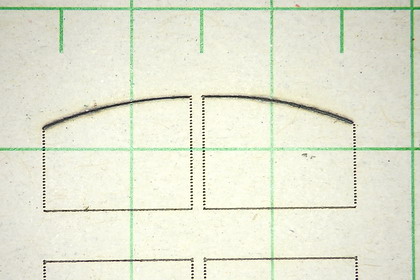 | 窓の中桟を抜いた後、厚紙の裏から眺めた様子。 レーザービームによって焦げた様子が判ります。 焦点でのビーム形状が、130μm × 30μm と扁平なため、 横のラインは、連続して切断できていますが、 縦のラインは、ステッピングモーターの、一ステップ毎の破線状に、 穴が開いています。 しかし、軽くカッターナイフを通せば、簡単に切り離すことができます。 |