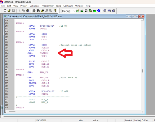 | 縦横のラインを、レーザーで抜くのは簡単ですが、 このRを抜くファームウェアを構成するのは、一苦労です。 その要点を、極々、簡単に説明すると・・・ まず、ステッピングモーターの移動分解能は1/4ステップに微細化し、 切断面に、階段状のギザギザが現れない様にします。 レーザーヘッドの位置は、円の一部を描くので、基本的に三平方の定理、 R2=X2+Y2 を使って、算出しますが、 それを、直接ファームウェア上で計算するのではなく、 X軸の1/4ステップ移動毎に、Y軸の移動量を示した、数表(Table)を、 予めファームウェア上に用意しておき、 それを参照しつつ、レーザーヘッドを移動させる形を採ります。 この様にすると、演算の手間が大幅に軽減されるため、 処理能力の小さいPICマイコンでも、実用的な制御が可能となります。 また、 曲線は中心線に対して対称なので、 その半分だけを実装し、データ量の削減を図ることは云うまでもありません。 それでもコードは、数表(Table)の200行を含む全体で、900行程になりました。 この歳、ボケ気味の頭で、アセンブラを組むのはなかなか大変で、 昔なら、しなかった様なケアレスミスがいくつもあり、 そのバグ退治に時間を取られました。 上写真は、MPLAB IDE という、アセンブラの開発環境です。 矢印が CALL TABLE0 でテーブルを呼び出しているところです。 |