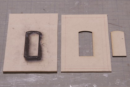 | それで、レンガ壁面芯材の切り抜きも、レーザーカッターでできるのでは? と思い、試しにMDF材を抜いてみました。 左は、MDF材 t4.5 で、繰り返しレーザーを通してみても、 焦げ、炭化が酷くなるばかりで、一向に抜けません。 右は、t2.5 で、何と、一回のパスで綺麗に抜けました。 なお、いずれも、切断速度は、85mm/min レーザーパワーは、MAX(5W) です。 t4.5が、うまく抜けないのは、 焦点から外れたところの、ビーム形状が広がっている事によるものと思われます。 |
