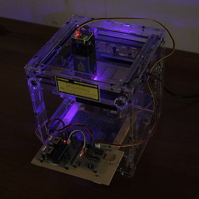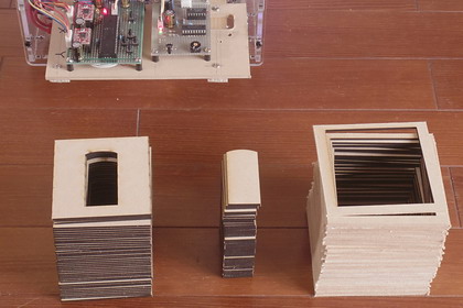| それで、t2.5 のMDF材を、二枚重ねにして使用する事にしました。 機械力に頼れば、量産は苦にならないので・・・ 写真は、レーザーカッターで抜いているところ。 レーザー散乱光が、紫色に不気味に光っています。 何か、怪しげな作業をしている雰囲気。 |