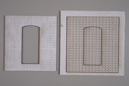 | レンガ機関庫の内側壁面は、 白セメントか白ペンキか判りませんが、多くが白く塗装されています。 プロトタイプの新庄機関庫もそうなっています。 Facebookで英国機関庫モデル等を見ていると、 その様子まで、丹念に再現されているものがあり、 羨ましく眺めてました。 しかし、それはレーザー彫刻を使えば、簡単に再現できるのでは?と思い・・・ MDF材をアクリルガッシュで白く塗装した上、 左は、レーザーパワーを、最大出力(5w)の6%(1/16)に落としたもの、 右は、12%にしたもの、でレンガパターンを彫刻してみました。 いずれも彫刻速度は、85mm/min です。 始めにレンガパターンを描画し、 その後、レーザーパワーを最大にして、窓と周囲の切断を行っています。 少し困るのは、レンガパターンの描画に、 非常に時間が掛かる事です(一枚、1時間45分くらい)。 パワーを弱めた、左側が良さそうです。 描画のかすれ、線の乱れ等もあるところが、面白いです。 また、焦げや発煙によって、自動的にウェザリングまでなされるのは、 素晴らしい副次効果です。 レンガパターンはもちろん英国積みです。 ファームウェアは同じ作業の繰り返しになるので、それほど難しくありませんでした。 |