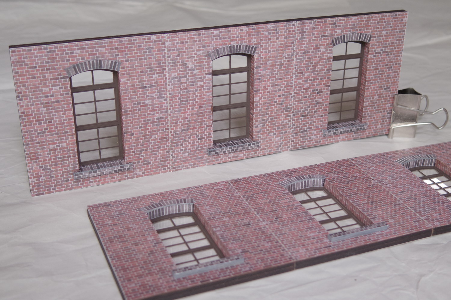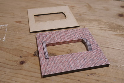| レーザーカッターで、MDF材を切り抜き、レンガペーパーを貼り付けました。 レンガペーパーはいつものように model brick yard でデータを作成。 レーザープリンターで印刷して作りました。 レーザープリンターを使用する理由は、退色が少ない為です。 |