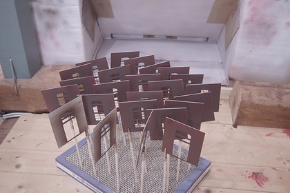| レーザーカッターで切り抜いた窓枠を、 塗装しているところ。 |
