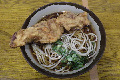 | 久々に堪能する、巨大な「唐揚げ一個入り」そば・・・ 「唐揚げ二個入り」もありますが、胃が小さくなった今では多過ぎで、とても食せません。 |