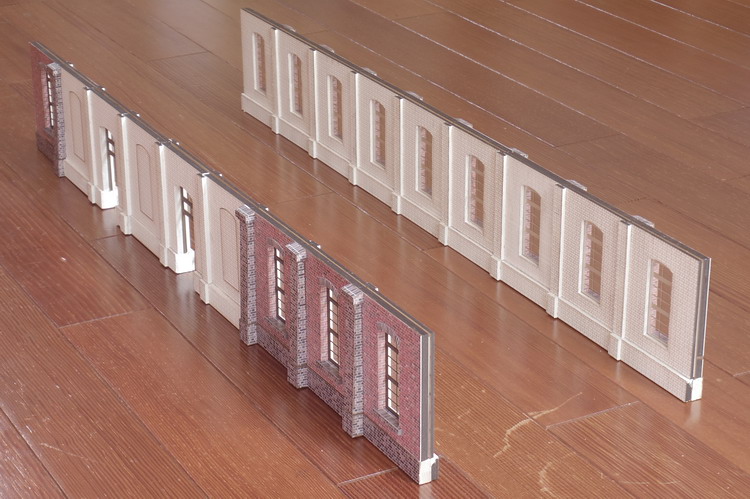 | 側柱の連なりや、厚みのある壁など、レンガ建築の重厚感を、 多少なりとも表現できたように思います。 機関庫全長は、108フィート/32.9m (Oスケール:731mm ) のタイプ。 次週は、この壁面の上に重なる、エンタブラチュアと称する部分を製作します。 |