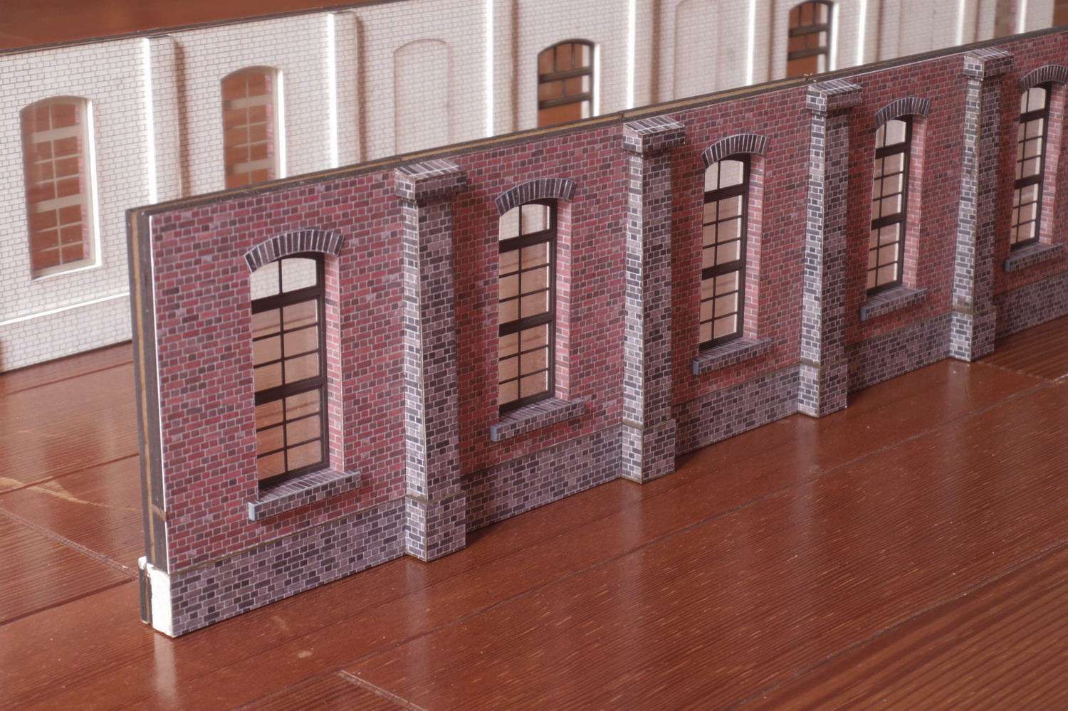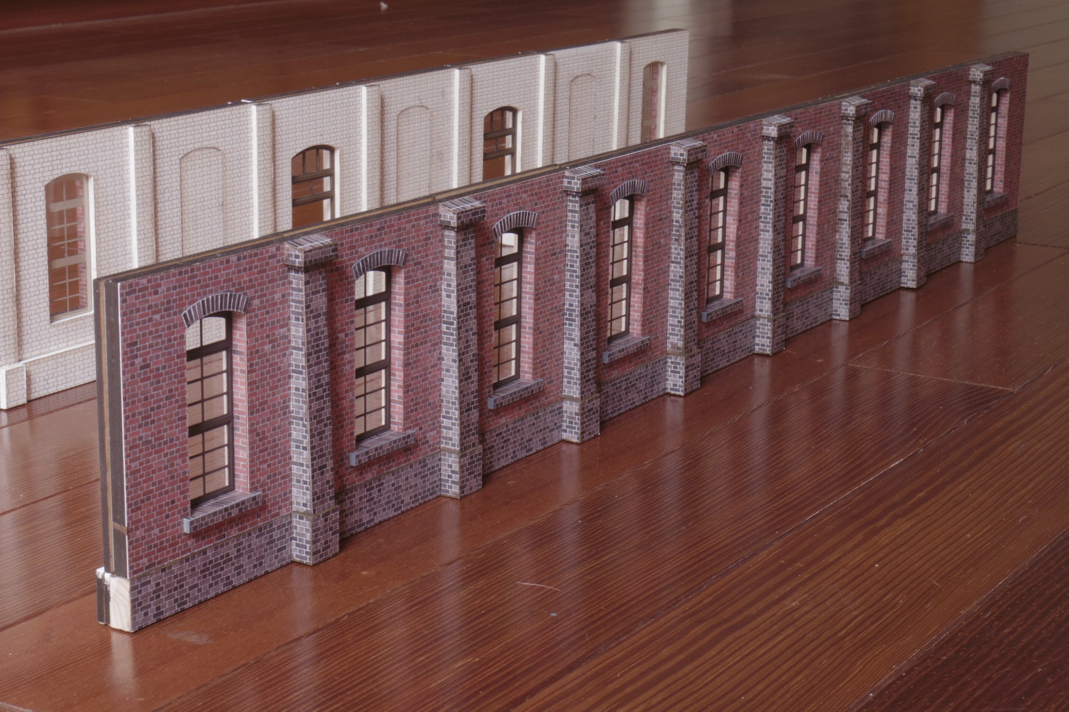 | 窓枠は、自作のレーザーカッターで抜きました。 実感的なシャープな表現が気に入っています・・・ レンガ壁の芯材は、t2.5 のMDF材とし、そちらも窓をレーザーで抜いています。 MDF材に、レーザープリンターで印刷した、レンガペーパーを貼っています。 レンガペーパーのPDFデータは model brick yard で作成しています。 できれば、レンガ目地の部分を少し削って、 レンガ積みも立体的な表現にしたいと思うところですが、 それは贅沢というもの? |