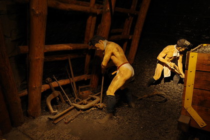| 石炭採掘の展示。 ジムクローというレールを曲げる治具。 模型でも似たような治具がありますな。 |