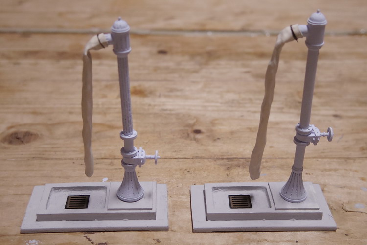 | 給水柱頭部は、フルーティング有りと無しを製作しました。 頭部のフルーティングも30°毎と、それほど密でないタイプとしました。 吐水口に続くランナーは、エポキシ注型時のための処置です。 |