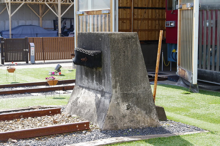 | くりでんミュージアムに残された制走堤。 連結器が衝突する部分は、古タイヤを重ねたものです。 天面での、幅 1000mm、奥行 500mm |