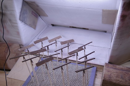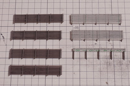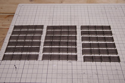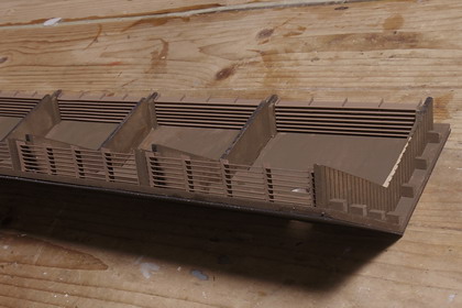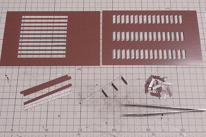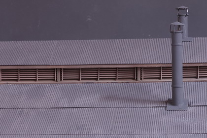 | 機関庫の煙り出しに接着。組み込んでみたところ。 横桟下側にできる隙間が、若干、大きかったようです・・・ もう少し組立の順番を考えるべきでした。 機関庫によっては、ガラリを通して向こう側の空が透けて見えたりしますが、 作例は、残念ながら寸法の関係上、そのような風流な具合にはなりません。 |