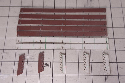 | 材料は、工作用紙から自作レーザーカッターで切り抜きます。 中央下が、ピンセットで仮組みを始めたところ。 |
