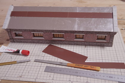 | 屋根の加工をしているところ。屋根ベースはアルミ板です。 この上に片面段ボールを貼って波板を表現します。 左から二番目と三番目の窓だけ少し大きく、窓桟もそこだけ多く入っています。 |