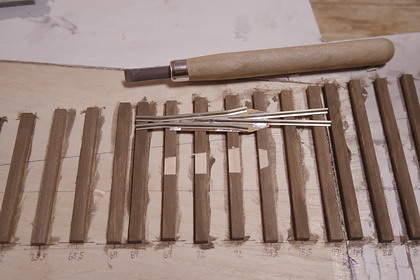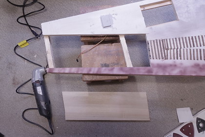 | 轍叉部(クロッシング部)床板の入る部分を削っているところ。 轍叉部は、外形が同じなので、他のレールと同じく左右共用とする事もできますが、 厳密には、ノーズレールの長さに左右の区別があるので、 (分岐側のレールがノーズ端まで達している) 以前、製作しておいた左分岐器用を充当しました。 離れて見ると全く判らないので、ほとんど気分の問題ですが・・・ |