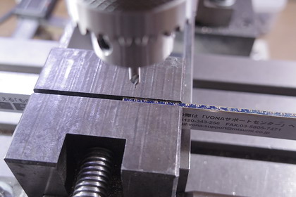 | 上で切り出した帯板に、4mm 間隔に穴明けをしているところ。 先ブレを防ぐため、先ずセンタードリル(写真)でマークして、 その後、ドリルに持ち替え貫通させます。 DROを使えば、極めて正確に加工できます。 |