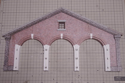 | アーチ部分を完成させます。 このようにレンガペーパーを接着していき、 はみ出た部分をカッターで削ぎ落します。 レンガペーパーは、いつものように model brick yard でPDFデータを作成し、 レーザープリンターで印刷して作成しています。 |