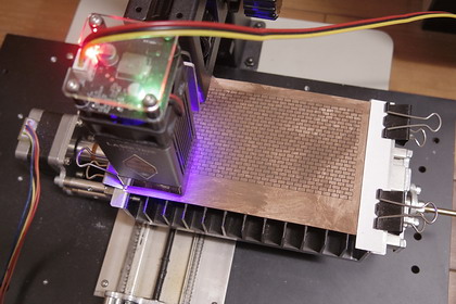 | レーザーカッターで彫刻しているところ。 一旦、セットすれば、後は自動で出来るのはいいのですが、 一枚、彫刻するのに、二時間半も要してしまいます。 |