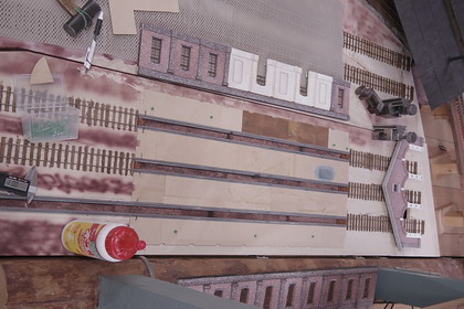 | 一年ほど前、Facebook に載った英国レイアウトに、 陥没が起きて、レンガ列が乱れている状況の、見事な表現があったので、 それを真似てみました。 石粉粘土で凹んだ地面を作っておき、 それに、レーザーパワーを少し強めに設定し、 レンガを個々に切り離したものを貼り付けました。 オリジナルほどの素晴らしい表現とはなりませんでしたが、 それでも少々、面白味が出せた様です。 |