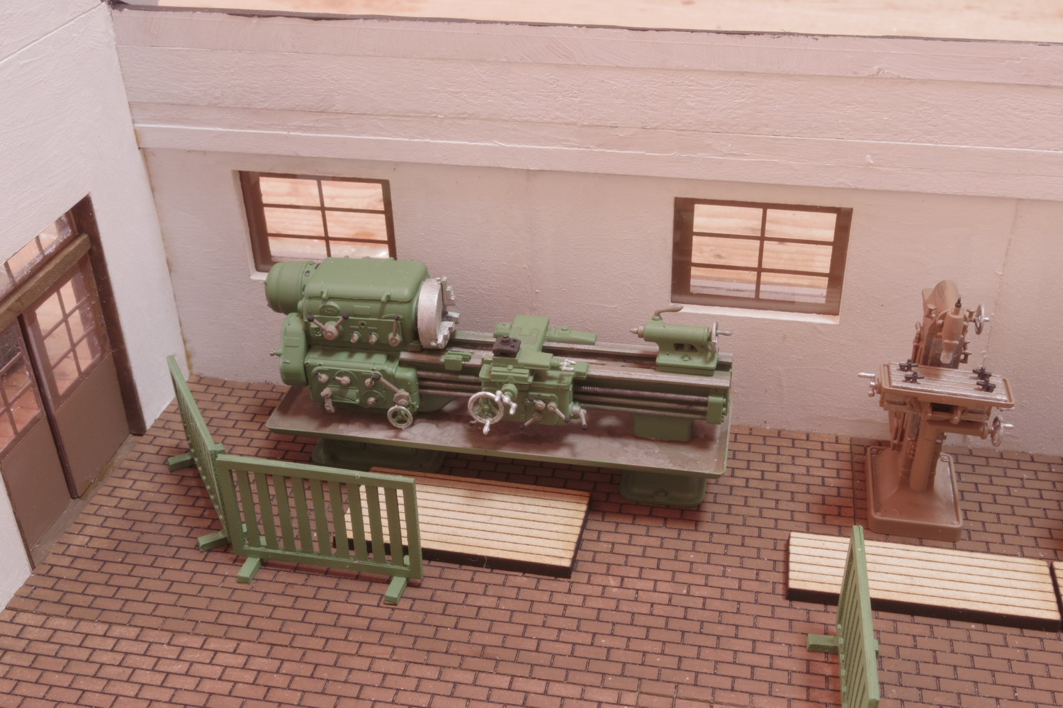 | 組立、塗装して技工場に置いてみました。 プラモデルとはいえ、非常に細かいパーツが多くて、 老眼の身には意外に苦戦させられました。 右の旋盤は、その昔、モデルワムさんから購入したOスケール金属製のもの。 |