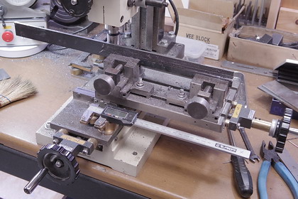 | さらに岡崎精工の t0.8 メタルソーで、2mm厚になる様、スライスします。 XYステージの稼働範囲が足りないので、写真は途中までとなっています。 材料がかなり硬いのでハンドルを回すのも重労働です。 ジグソーのブレードはあっという間に坊主になってしまいましたが、 岡崎精工のメタルソーは、全行程を通じて一回交換で済みました。 この硬い材料に対し、よく持ったもんだと感心します。 パキスタンの職工さんを見習って、消耗したメタルソーはいずれ砥ぎ直します。 |