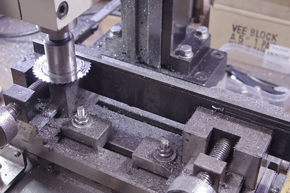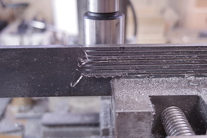 | アップカットよりダウンカットの方が、若干、直進性が良いようなので ダウンカットで切り進めることにしましたが、 それでも一回、失敗がありました。 真鍮材なら造作もない加工ですが、やはり鉄材は難しいです。 材料一式、切り出すのに三日も掛かってしまいました。 写真は、把握をやり直して、残りの部分の切断をダウンカットで行っているところ。 メタルソーを右回りにセットしているので、材料に対し切り下げる方向で切削が進みます。 フライス盤のXYステージは、アマチュア用のためガタ・バックラッシュが多く、 切り刃が食い込む危険があり、本来、ダウンカットには対応できないのです。 しかし、そこはパキスタン精神で乗り切ります。 いずれ、ダウンカットにも対応できる様、ステージ軸受の改造を施したいと思っています。 |
