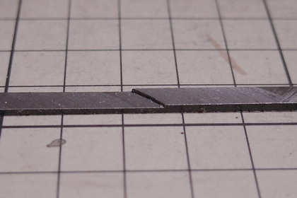 | 材料が硬く、しかも不均質なため、 切断途中で、メタルソーがしなってしまい、 真っ直ぐ進まず、進路を逸脱することがあります。 それで写真のような段差が付いた状態に・・・ これはもう使えません。 |