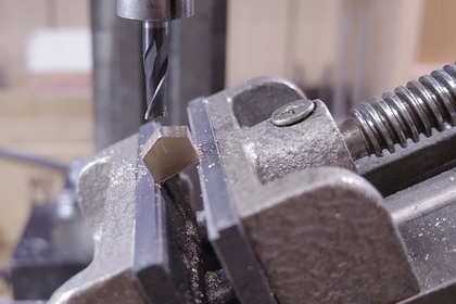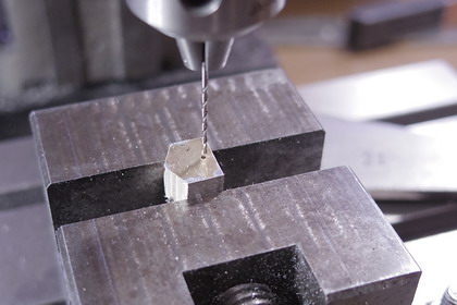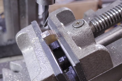 | 頂部のガセットプレートの製作方法です。 五角形なので、個々に製作すると面倒です。 先ず、四角に切り出した真鍮板を重ねてハンダ付けしたものを、 アングルバイスに銜えて、フライス盤エンドミルで削ります。 アングルバイスは、小物を銜え易い様、口金を写真のように段差加工してあります。 |
