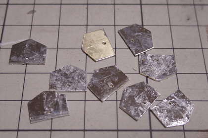 | ハンダごてを当てて、個々にバラすとこんな感じ。 形状の揃ったのが簡単に量産できます。 ハンダで埋まった穴は開け直します。 これ以外のガセットプレートは、単なる長方形としたので、 サーキュラソーで、個々に真鍮板から切り出しました。 |