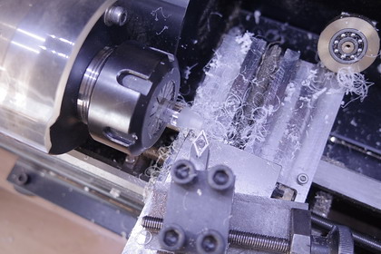 | 当初、照明器具の傘を、 熱して柔らかくしたプラ板を、掃除機で真空引きする、 真空成型法で作ろうとしたのですが、 初めての技法で、どうにもコツが掴めず断念・・・ そこで、 Φ10 アクリル棒から旋削する方法に切換えました。 LEDの入る部分、Φ3.2 深さ6 の穴を開けた後、 トップスライドを 15° にセットして、円錐状に旋削します。 このあと、突っ切りで切り離します。 一個20分くらいで出来ましたが、 旋削時に、送りを急ぎ過ぎると、刃が過熱してワークが溶けます。 (下写真の右下、LEDが付いていない傘。下面が溶けてアバタになってます。) |