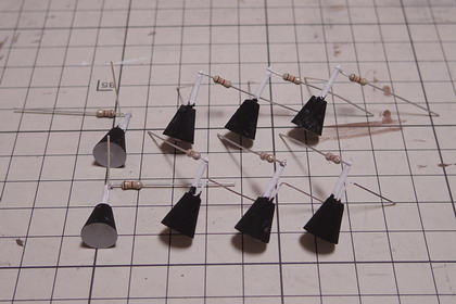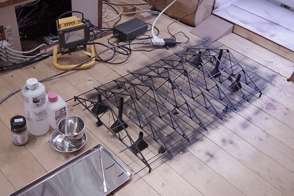 | 傘は塗装によって表現します。始めにライトグレー、次いで光の透過を防ぐための、 暗黒ブラック(アクリルガッシュ・ターナー色彩)を塗ったところ。 この後、さらに、ライトグレーを塗り重ねます。 抵抗器が付いていますが、これは後で、トラス枠上の目立たない位置に移動しました。 |