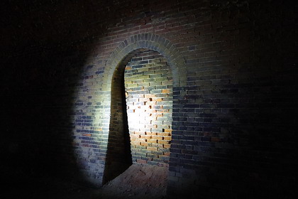 | 見学地に着いて最初のトンネル。第二耳ヶ谷隧道北口。 見学者が大勢居るので、カメラを高く掲げて撮影しています。 左側には不釣り合いなほど小さな翼壁が付属しています。 雑草が刈られていて、よく観察できます。 |
