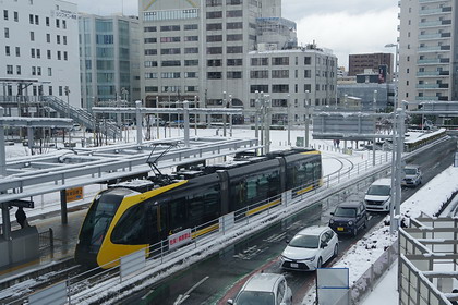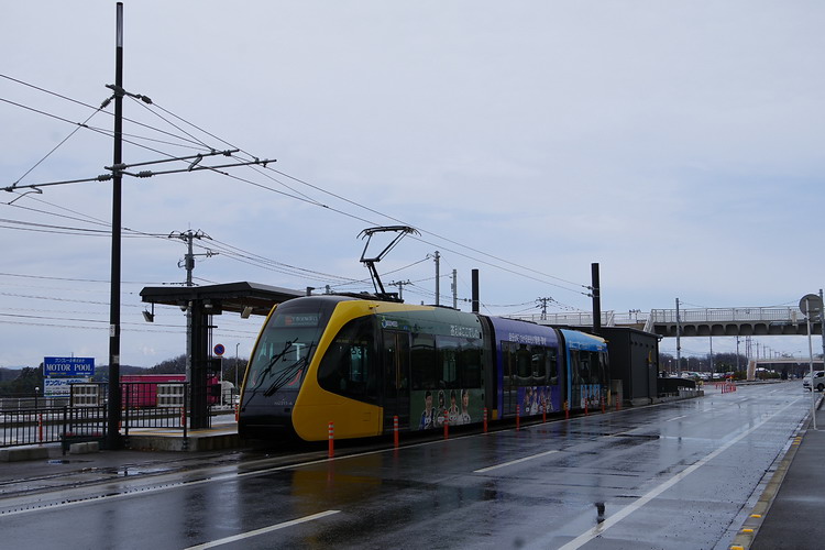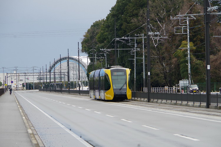 | 周りは工業団地です。 3連接の車両ですが、各車両のほぼ中央部に台車があります。 それで走行中、蛇行動を起こさないのか?と心配になる。 色々工夫されているのでしょうが・・・ |